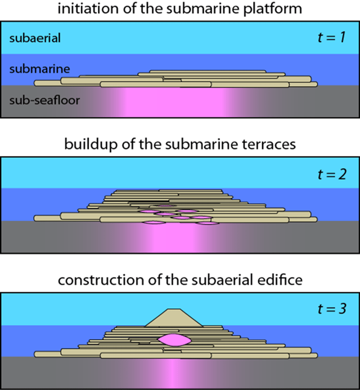 Additionally, it remains unclear how platform volcanism relates to the construction of subaerial volcanoes that make up the islands in the Galápagos over space and time. Are the volcanoes built on top of the Platform, or do the volcanoes grow first, and then surrounded by younger Platform lavas?