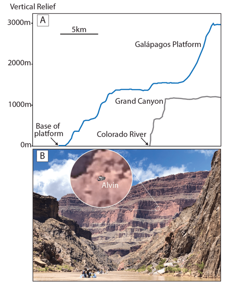 The Galápagos Archipelago is unique compared to these examples because it is positioned atop a broad submarine platform that rises more than 3000 meters above the surrounding seafloor; this is nearly twice the height of the Grand Canyon (Figure 1).
