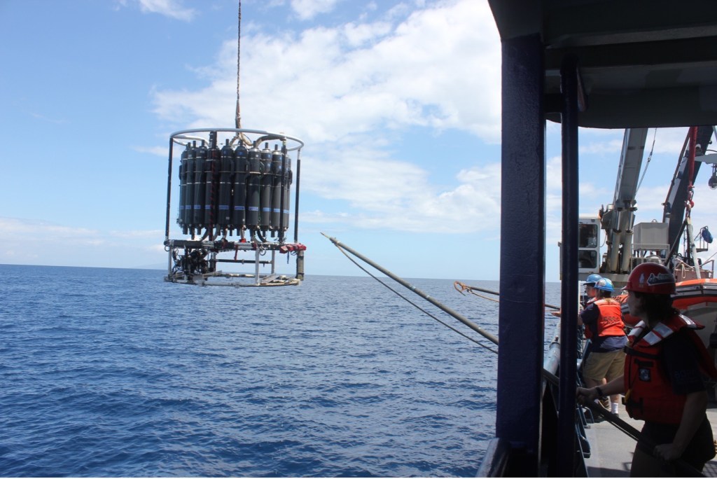 Dive time! Three people go in the submarine Alvin: the pilot and two scientists. Today, Nick is our driver, and Michelle and Darin are the scientists. They will be using their biological and geological expertise to collect images and samples to understand the deep-water biodiversity and geology of Galapagos. Alvin is in the water, and everyone gets ready to have an afternoon of preparation for when they are back on deck. But, operations at sea bring surprises sometimes. It was a short dive of ~1h, so Alvin is back much sooner than expected. Everyone mobilizes to bring some buckets filled with cold water to put the samples in. Meanwhile, another group (myself included) gets ready for water sampling. There is no time to waste, we get our hard hats and life jackets on and go to the deck to deploy the rosette and CTD. This equipment consists of sensors which measure properties of the seawater in real time such as temperature, salinity and dissolved oxygen. Also, it has 23 bottles which are used to collect seawater from different depths. The collected water will be analyzed later (in labs on land) to get information about seawater parameters such as nutrients, 14C, pH and alkalinity.